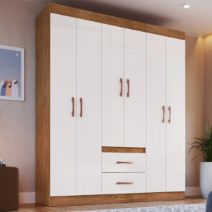 A estrutura é fabricada em MDP com acabamento em pintura UV brilhante. Os puxadores externos são em PVC com acabamento cromado. Com 175 cm de altura, 137 cm de largura e 38 cm de profundidade, o móvel aproveita bem o espaço vertical e atende à necessidade de armazenamento em ambientes menores.