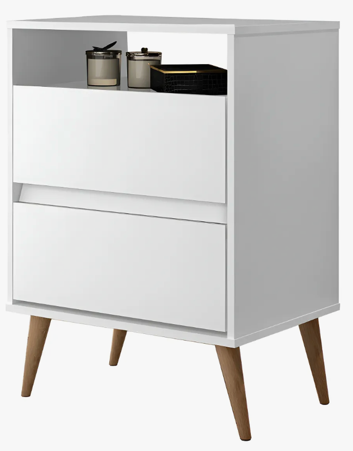 A Mesa de Cabeceira Lótus possui design retrô com pés palito em madeira, oferecendo funcionalidade e um visual elegante para o ambiente. Conta com duas gavetas e um nicho, ideais para organizar itens de uso diário. Produzida em MDP de 12 mm com pintura UV, tem boa resistência e durabilidade.