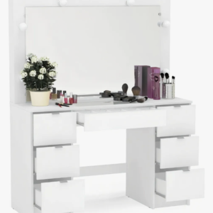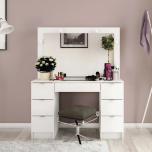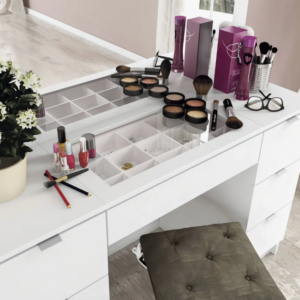 A Penteadeira Camarim França da Politorno foi desenvolvida para quem procura um espaço organizado e bem iluminado para maquiagem e cuidados pessoais. O modelo conta com sete gavetas que ajudam a manter produtos, acessórios e cosméticos separados de forma prática. Uma das gavetas possui divisores internos, útil para joias e pequenos objetos.