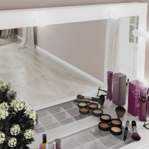 O espelho retangular vem com soquetes para instalação de lâmpadas do tipo bulbo, criando uma iluminação uniforme para o dia a dia. A estrutura é produzida em MDP com acabamento BP fosco, oferecendo boa durabilidade e um visual discreto. A penteadeira acompanha fiação, interruptor e soquetes, facilitando a instalação. As lâmpadas não estão inclusas, permitindo escolher a intensidade de luz que preferir.