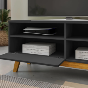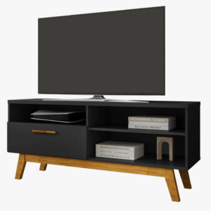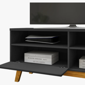 O Rack Paládio combina design retrô com linha moderna, trazendo pés em madeira maciça que garantem estabilidade e visual diferenciado. Ideal para TVs de até 55 polegadas, conta com três nichos para eletrônicos e objetos decorativos, além de uma porta com amplo espaço interno. A estrutura em MDP e o acabamento em pintura UV oferecem durabilidade para uso diário.